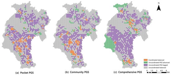 (5) The development between PGS and SED is not coordinated in more than 95% of the study area, and most of the uncoordinated area at the periphery is of low balanced supply–demand matching type. Without proper planning, the supply of PGS will not meet residents’ demand in the area.