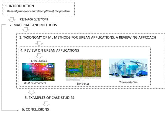 The remainder of the paper is organized as follows (Figure 1). Section 2 broadly describes the taxonomy of the contents of the review for urban applications related to ML uses. In Section 3, different challenges are discussed with respect to the built environment, land uses and the transportation, to cite the most important among them. Section 4 provides a portfolio of concrete examples and cases to retrieve lessons learnt, and Section 5 concludes the review.