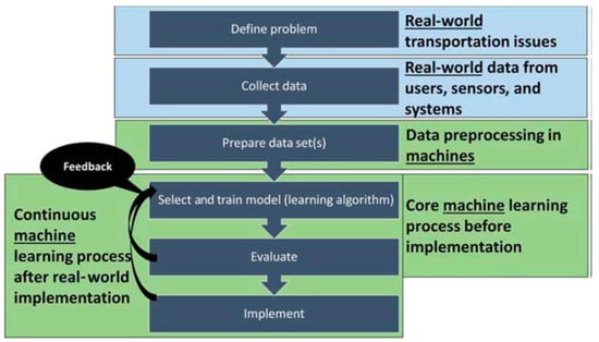 As ML transcended the conventional techniques of modeling, a huge potential of big data management to address complex city problems is presented at the crossroads of modern urban planning challenges to make up their dynamics [12,13]. Broadly speaking, ML consist of a group of different models and patterns with the ability to minimize error using repeated processes from data collection, analysis and monitoring [14]. Based on the existing definitions, Machine Learning consists of a set of techniques to automatically detect and predict data or perform decision-making processes under an important level of uncertainty [15]. Hence, ML consists of methods leading to evidence-based processes to meet the standards and quality of a complex problem. Its rapid evolution and growth, with the parallel emergence of its potential, will equal the challenges of modern cities in several fields (mobility, energy, etc.). More and more cities are being included in this dynamic, which concerns the drivers of the urban functionalities or decision-making processes optimizing performance and leading to automation. Overall, the existing ML demonstrations on urban and spatial problems consist of spatiotemporal subjects [16]; however, their implication has not yet been fully explored, despite their large repertoire [17].