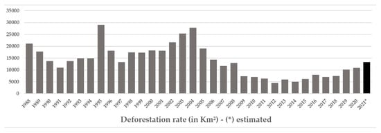 Annual rate of deforestation—estimates for 2021 in black. Source: Official estimates by the Instituto Nacional de Pesquisas Espaciais (INPE)9.