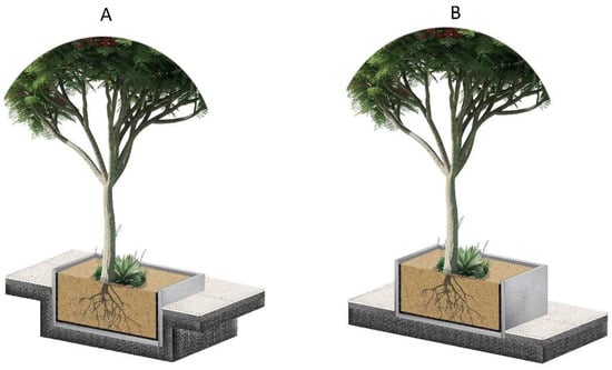Lastly, to reduce risk of failure and increase safety, existing literature explains that planters should be designed to prevent trees growing as much as they would in under unconstrained natural conditions []. International practices for growing plants in containers and planters generally recommend a range from 8:1 to 10:1 for the ratio rootball diameter: trunk diameter. This range allows the rootball to provide a quality root system [,,]. However, some city councils require the use of 0.6 × canopy projection at tree maturity as a minimum soil volume to increase implementation success [].