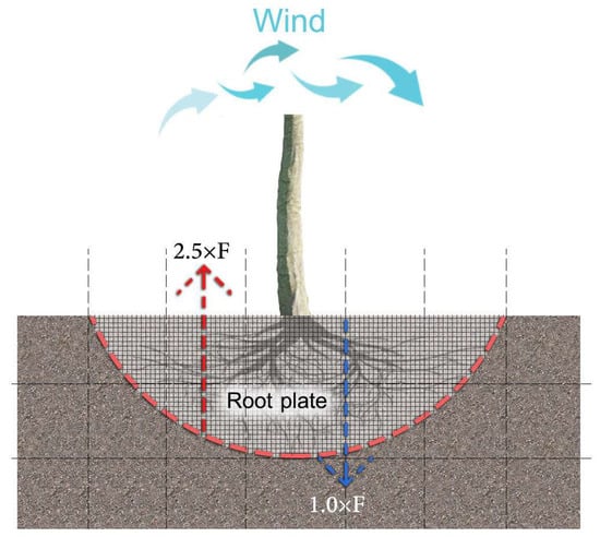 Note. Wind loading and gravity act as a combined load wheel, which responds to tree failure in the case that the root anchorage is not sufficient outside the load wheel. Illustration based on Coder []. F = wind load force on the treetop.