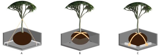 Different anchoring system types, illustrated based on the Melbourne guidelines []. (A) = plate anchorage system, (B) = rootball anchorage to planter wall, and (C) = anchor straps and ‘dead man’ system.