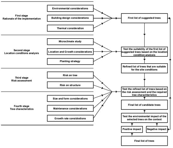 This study reveals that the industry approach of selecting appropriate tree species for implementation on buildings does not contradict existing frameworks for tree selection in urban paved sites (e.g., for street trees) but includes more specific analyses and requirements to adapt to the implementation context. Therefore, based on the above, this section aims to synthesise the approaches of the participating experts to guide a successful and safe tree selection for implementation on buildings. As a result, a tree selection framework was developed based on current industry best practices (Figure 5). The framework consists of four sequentially mandated stages: