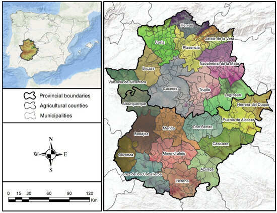Figure 1. Location of study area. Municipal distribution in the agricultural counties of the Autonomous Community of Extremadura.