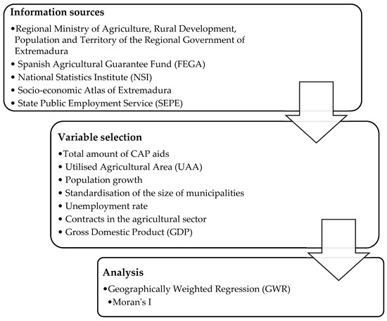 The following figure (Figure 2) shows the process carried out for the development of this research. Firstly, the necessary data were obtained from different sources of information in order to subsequently calculate the agricultural, economic and demographic variables. Thus, it was considered that the selection and use of the following variables (Table 1) was the most optimal for the development of this research, since, as has been observed in previous studies [6,54,55], they reflect the influence of this type of aid on the socio-economic reality of Extremadura’s municipalities. These variables have been used to create the regression model and its validation by means of Moran’s I.