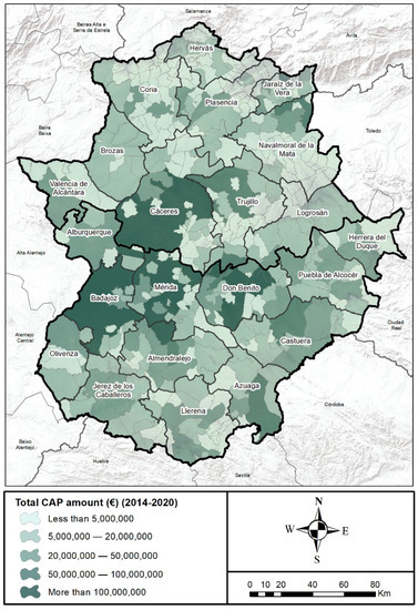 Using GIS tools, demographic, agricultural and socio-economic variables have been analyzed spatially and the possible interrelationships between these variables and CAP support have been observed. The importance of this aid in Extremadura is very notable, as it was the fourth Spanish region that received the most money through this European policy during the period under study. A concentration of aid has been observed in the most dynamic areas of the region, with municipalities with a larger population and a significantly productive agriculture, mainly related to irrigated farms. Thus, there is a significant disparity in the distribution of CAP amounts in Extremadura, as there is a high concentration in the municipalities with the highest population. In this way, it is established that the distribution of aid is mainly established in areas where there is a high population density, where the most productive crop systems exist and in those territories where the natural limitations of the terrain are scarce. The great majority of these municipalities are located in areas with the most developed agricultural production systems, such as irrigation, and around the main communication routes, which has led to the development of a consolidated agri-food industry. In contrast, mountainous areas receive smaller amounts, due to their regressive territorial and population characteristics. This means that there is a clear disparity in the funds received by the municipalities, with funds being diverted to those which are also located in the vicinity of the main communication routes and whose areas have optimal physical characteristics that have allowed them to exploit the territory competitively, both in the agricultural and livestock sectors. Moreover, they are suffering a progressive loss of population and an ageing population, with the generation that has traditionally been dedicated to the agricultural sector disappearing.