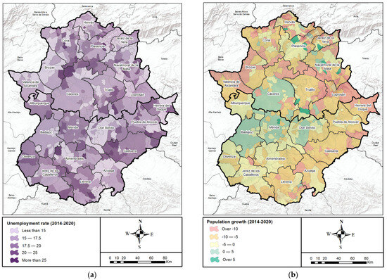 Figure 4. Territorial distribution of socio-demographic variables by municipality. (a) Unemployment rate (2014–2020); (b) population growth (2014–2020).