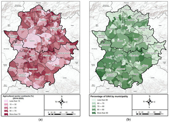 Figure 5. Territorial distribution of agricultural variables by municipality: (a) agricultural sector contracts (2014–2020); (b) percentage of UAA.
