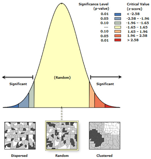 Moran’s Global I indicates the degree of correlation between the values represented, with a value ranging from −1 to +1. Positive (clustered) values indicate the existence of similar analysis values, either high or low, while negative (dispersed) values indicate values that are different from each other. Random values are those close to 0, which show little spatial relationship between the values [69]. The Moran Global I presents a z-score and a p-value, which are measures of statistical significance that establish whether or not the null hypothesis should be rejected. The z-scores are standard deviations that can be very high or low and are regularly associated with very small p-values that are set in the tails of the normal distribution. This p-value is a probability and when it is very low, it means that it is very unlikely that the spatial pattern presents random results, thus rejecting the null hypothesis [70].
