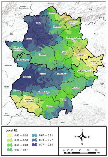 After performing the GWR, the values obtained for the multiple R2 and for the R2 are 0.82 and 0.77, respectively, which means that the variability of the selected variables is explained with an accuracy of more than 75%. The closeness of the values to 1 reflects the suitability of the variables for the study and the high proportion of the variance of the dependent variable (total amounts of CAP support) explained by the regression model. The spatial distribution of the local adjustments produced with the GWR (local R2) allows us to know the spatial variation of the explanatory power of the model. For that reason, the distribution of the local R2 at the municipal level (Figure 7) varies between 0.43 and 0.84, reaching the highest values in the municipalities located around the Vegas del Guadiana, in the central area of the region, and in the Valle del Alagón in the northwest, where they increase to over 0.77.