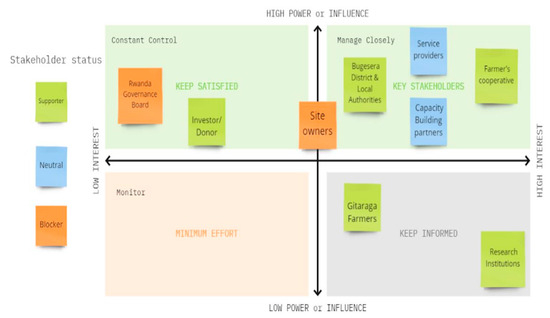 Additionally, we conducted a stakeholder identification, analysis, and mapping process. The identified stakeholder groups include the Rwanda Governance Board, Bugesera’s district and local authorities, service providers, capacity building partners, investors/donors, research institutions, site owners, and Gitaraga farmers. Their levels of power and interest, along with their roles in the PAR project (supporter, neutral, blocker), are illustrated in Figure 2.