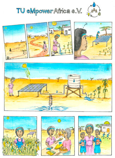 Hand-illustrated textless educational comic for solar-powered irrigation system. Source: TU eMpower Africa e.V., in Devadas [92].