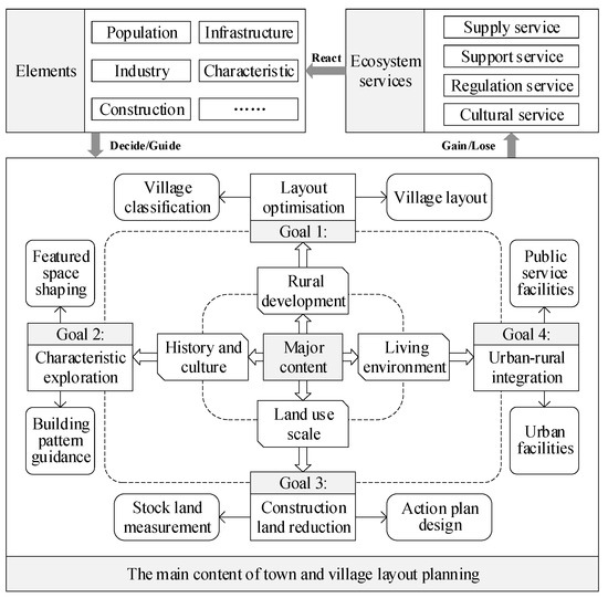 Town and village layout planning is crucial for optimising village development. It seeks to address issues related to population, industry, construction, and facilities by analysing their characteristics, determining the best course of action for the village’s overall layout, integrating urban and rural areas, and reducing construction land use. The planning process involves a reasonable classification of village types, functional zoning of the village, protection of historical and cultural values, and provision of equalised basic public services. Furthermore, the plan aims to determine the boundaries of the village and regulate its construction by considering land utilisation and development. The impact of human activity on ecosystems is a critical issue that can be addressed in the context of town and village layout planning. The village and town ecosystem is a complex natural–artificial system that entails interactions between people and the environment [
