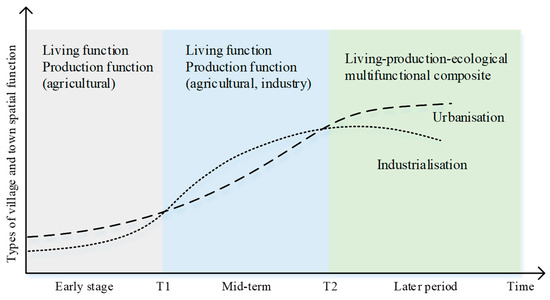 The market demand for villages and towns was limited in the early stages of industrialisation and urbanisation. Agriculture dominated the national economy and accounted for a substantial share of it. To accommodate the needs of urban development, most regions chose rural support for cities and agricultural support for industry, which led to the outflow of various resource elements from rural to urban areas. Hence, the predominant spatial functions of villages and towns were centred on living and agricultural production. As industrialisation and urbanisation progress, the heterogeneity of urban–rural spaces begins to facilitate the convection of factors and industrial integration. Villages can undertake the industrial transfer of cities while providing labour, resources, and other production factors for cities. The relationship between urban and rural areas evolves from simple mutual interaction to symbiotic integration, thereby broadening the connotation of production functions and elevating the significance of industrial production functions. However, industrialisation and urbanisation have also resulted in environmental degradation and pollution, thereby leading to a growing recognition of the importance of ecological conservation. Consequently, ecological functions have become increasingly important in the later stages of urbanisation and industrialisation, which causes a transformation of spatial functions into an organic integration of production, living, and ecological functions (