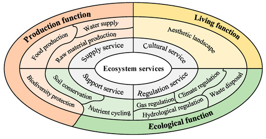 33]. In the theory of territorial spatial planning, the functional space of a region comprises ecological, production, and living spaces, which correspond to the ecological, production, and living functions of ecosystems, respectively [