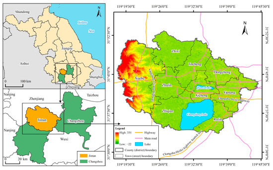Figure 4). The terrain gradually becomes gentle from west to east, with hills and mountains in the west and low-lying plains in the east. Jintan District is rich in natural landscape resources and has important ecological service functions. Jintan District comprises 97 administrative villages, 8 communities, a street office, a forest farm, 2 tea farms, 2 fisheries, a livestock farm, and a comprehensive agricultural service station, with a total area of approximately 894.87 km