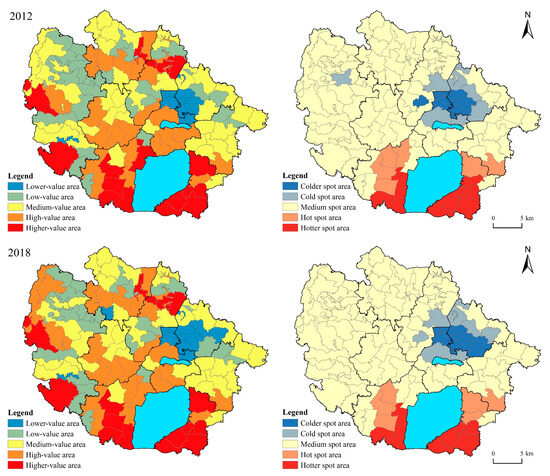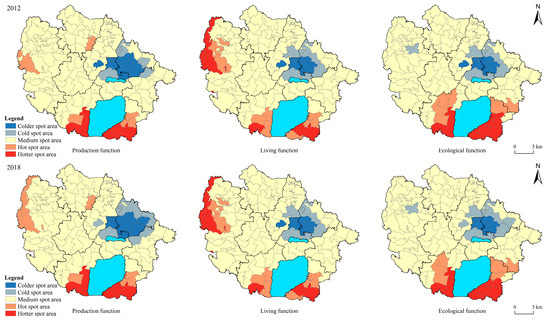 Through hotspot analysis, we found that the south of Rulin Town and Zhiqian Town had common hotter and hotspot areas for the three functions. However, hotspot areas and hotspot areas of production and living functions were found to have a broader spatial distribution than that of the ecological function. The production function had two hot spot areas in the central part of Xuebu Town and southeast of Zhixi Town, while the living function had a north–south hotter spot area in the northwest of Xuebu Town. In the two time periods under examination, the colder spot areas were located in Dongcheng Street, Xicheng Street, and villages in the southeast of Zhixi Town in the urban area. Compared with 2012, the colder and cold spot areas of the production function expanded to encompass Dongcheng Street in 2018, with a tendency to extend to Yaotang Street. Meanwhile, the colder spot areas and cold spot areas of the living function remained unchanged, whereas the colder spot areas and cold spot areas of the ecological function increased slightly. Moreover, villages located on both sides of the western hills and around Changdang Lake showed high ecological system service values, manifesting as higher-value or high-value agglomeration areas. Conversely, in the administrative centres, towns, and economic development zones represented by Dongcheng Street, Xicheng Street, and Yaotang Street, the value of ecosystem services has declined, forming low-value agglomeration areas spatially (