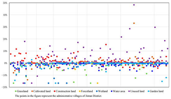 Figure 6 presents the dynamic degree of ecosystem service value for each administrative village, in which the horizontal axis indicates the administrative villages and the vertical axis shows the corresponding dynamic degree of ecosystem service value.