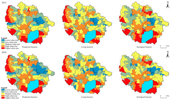 Figure 7, the results demonstrated the spatial distribution of villages with varying levels of production, living, and ecological functions in the Jintan District in 2012 and 2018. In 2012, villages with higher production functions were primarily situated in Rulin Town, southern Zhiqian Town, and western Xuebu Town. Furthermore, the villages with high production function were primarily concentrated in the north-central part of Zhiqian Town, the south of Zhulin Town, the central part of Xuebu Town, and the central part of Jincheng Town. In contrast, villages with lower production functions were mainly located on Dongcheng Street and north of Xicheng Street, with some additional distribution observed in the central and southern parts of Xuebu Town. Villages with low production function were mostly concentrated in the south of Jincheng Town and the intersection of Xuebu Town and Zhulin Town. Regarding living function, only a few villages exhibited higher living functions and were mainly situated in the central and northern parts of Rulin Town and the western and southern parts of Xuebu Town. In contrast, many villages with high living functions were located in Zhulin, Jincheng, and Zhiqian. Villages with lower living functions were widely distributed in the study area, with no obvious spatial agglomeration, and were observed on Dongcheng Street, Xicheng Street, Zhixi Town, Xuebu Town, and YaoTang Street. Villages with higher ecological function were found to be more dispersed in Jintan District, with concentrations observed in southern Rulin Town and Zhiqian Town. Some scattered higher-value villages are also located in northern Jincheng Town and western Xuebu Town. Compared with the production and living functions, there were fewer villages with lower ecological functions, mostly situated on Dongcheng Street and Xicheng Street. In 2018, the spatial distribution of villages in higher-value and high-value areas of production, living, and ecological functions remained relatively unchanged. However, the number of villages with lower-value production functions expanded towards the north, and the distribution of villages with lower living functions became more discrete. Conversely, the number of villages with lower-value and low-value ecological functions decreased, while the number of villages with medium-value ecological functions increased significantly (