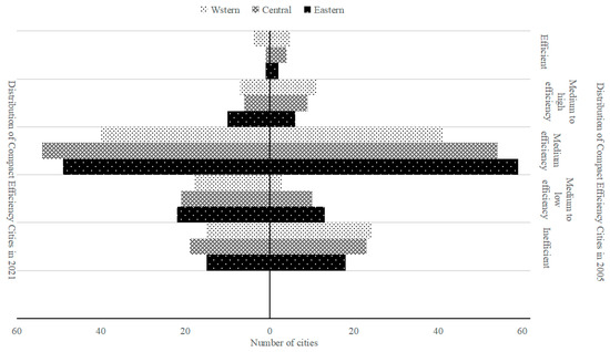 The effectiveness of Chinese urban development in achieving compactness, as measured across 282 cities, showed a fall from 0.9317 to 0.862 between the years 2005 and 2021. The pace of China’s urban transition in smaller cities seems to be decelerating. In the year 2021, it was seen that the eastern, central, and western from had decreased levels of efficiency in comparison to the year 2005. The regions located in the middle and western parts had a more significant decline compared to the eastern region. As shown in Figure 3, there has been a notable rise in the quantity of eastern cities falling into the low- and medium-low-efficiency categories. The observed trend reveals a decline in the quantity of cities with medium-efficiency, suggesting the adoption of a dual-tier strategy towards achieving a compact expansion in eastern urban areas. There was a drop in the number of low-efficiency cities in the central area, but there was an increase in the number of cities with medium-to-low efficiency. The drop in efficiency of the compact city practises in the central region may be mostly attributed to the decrease in the number of medium- and high-efficiency cities. In Western regions, cities with medium efficiency, medium-high efficiency, and high efficiency exhibited stability. The data reveal an increase in the number of medium-low efficiency cities, suggesting an improvement in the compactness efficiency of Western cities. The effectiveness of city compactness varies throughout the eastern, central, and western regions due to differences in resource endowments, development patterns, and national policies.