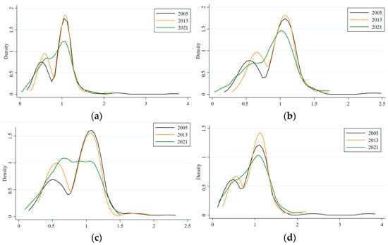 Moran’s index revealed the compactness efficiency’s geographical pattern. More research is required to comprehend this index’s temporal evolution patterns. Thus, density curve plots were generated using KDE to show the compactness efficiency of 282 cities in 2005, 2013, and 2021 (Figure 4a). Meanwhile, the geographical divides of the eastern, central, and western areas were used to highlight the temporal dynamics of local compactness efficiency. Figure 4b–d show how this approach illuminates the total urban compact development.