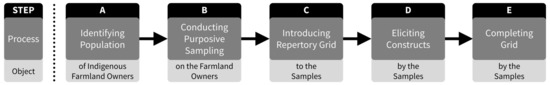 For decades, RGT has been the most recognized and widely utilized derivation of Kelly’s Personal Construct Theory [63]. RGT is an interpretative mapping technique aiming to describe how people use their cognition to perceive real-world phenomena [64]. It was originally used in psychotherapy, clinical counseling, and educational settings [72,73]. Since then, RGT has also been used to study human responses to urban activities [74], architecture [75], tourism [76], and natural environments [77]. Shaw and McKnight [78] stated that RGT is reliable for observing the underlying mechanism of the decision-making process. In the workflow (Figure 1), RGT gathers personal information (e.g., responses, opinions) from the observed individuals and turns it into a grid. In the repertory grid, elements represent the alternative decisions, while constructs represent what drives the alternative decisions. Links within the grid represent the importance of the criteria for the decisions. Theoretically, elements are the objects of attention within the domain of investigation. They are the things or events abstracted by constructs [79,80]. Consequently, the types of elements used in the grid will determine the types of elicited constructs [81]. Thus, the elements must be homogeneous (i.e., made up of all objects, events, and situations but not a combination of different groups), representative (i.e., represent an area under investigation [62]), and discrete (i.e., not a subset of other elements).