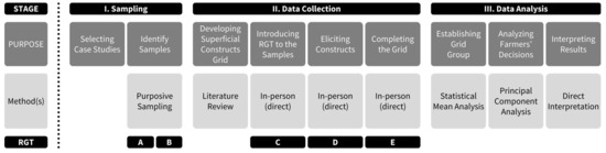 Following the research objectives, questions (RQs 1–3), and RGT workflow (Figure 1), this study was conducted based on a 3-stage design (Figure 2). In the first stage, this study selected multiple case studies within the same regional area for generalization purposes. In the next substage, the population of farmland owners in the case studies was identified and sampled using purposive sampling [82]. RGT, like other qualitative methods [83], aims toward achieving a more fine-grained and in-depth understanding of individual inquiries to build syntheses. Consequently, the issue of sample size and representativeness have little to no relevance to the validity of the research [84]. The second stage (Data Collection) began with the development of superficial constructs. Based on the third RGT step, the initial constructs were then introduced to the samples (farmland owners) through in-person meetings. In contrast to conventional research methods like questionnaires, the RGT protocol, as a qualitative method, avoids biasing the respondents with preconceived inquiries in formalized research instruments [85]. Thus, in the subsequent meetings, the involved farmland owners elicited their implicit constructs through their own thought processes with minimal intervention, as suggested by the fourth step in RGT. The constructs, according to the fifth RGT step, were later turned into the repertory grid in the meetings. After the grid had been completed, in the third research stage (Data Analysis), first, grid groups were established by applying statistical mean analysis [86]. The next substage focused on analyzing the farmers’ decisions according to the grid groups by employing Principal Component Analysis (PCA) [87]. Then, the results of the entire process were interpreted directly to synthesize the findings.