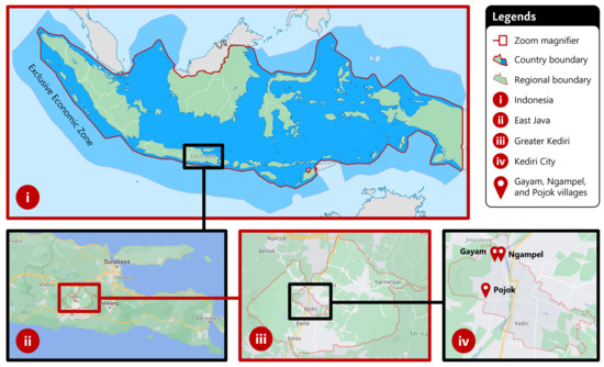 Gayam, Ngampel, and Pojok villages (iv) in Kediri (iii), East Java (ii), Indonesia (i).