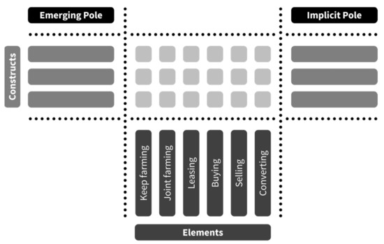 Focusing on the complex decision-making processes of farmland ownership requires expanded observations on individual cognition, not only by tangible economic factors, but also by personal, social, and cultural factors that may not be easily quantifiable. In that sense, the investigation should involve a cognitive mapping technique that could help describe how people think about decision-making processes over their farmlands based on their worldview [61]. At this point, the Repertory Grid Technique (RGT) [62,63,64,65] is particularly valuable in understanding ownership decisions regarding farmlands due to its focus on eliciting individuals’ subjective experiences and perceptions. The RGT is designed to reveal how individuals understand and interpret their world [66]. In the context of farmland ownership, it can shed light on how farmers perceive the benefits, challenges, and meanings associated with different ownership decisions. For example, it may reveal how farmers balance economic considerations with values related to family tradition, stewardship of the land, or community welfare [67,68,69]. Additionally, RGT can highlight individual differences in the ways farmers make ownership decisions, thereby acknowledging the heterogeneity within their communities. While individual differences are important, RGT can also identify common or shared constructs that are influential across a farming community or population [70,71]. These shared constructs could be indicative of broader cultural or social norms related to farmland ownership.