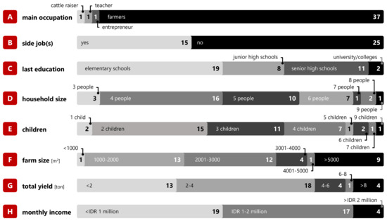 After completing the field surveys, this study first built the socio-economic profiles of the 40 respondents (Figure 5). In terms of occupations (A), most respondents considered farming their primary occupation. Only one respondent declared oneself primarily an entrepreneur while considering farming a side job. The rest (2 people) declared being a teacher or cattle raiser their primary occupation. Aside from their main livelihoods, more than half of the respondents (25 people) were not engaged in any side jobs, while 15 others had income-generating activities other than farming. Regarding the education level of the farmland owners (C), most of them (19 people) graduated from elementary schools, eight from junior high schools, and 11 from senior high schools, while only two have university or college degrees. Meanwhile, since this research involved farmland owners, only one person per family participated. Thus, this study gathered the profile of their household sizes (D). The sizes varied, with 3, 16, 10, and 8 owners having three, four, five, and six people in their households, respectively. A minor subset of the samples (four landowners) has more than six people in the households, with the largest size being nine people in one household. Regarding the number of children (E), only two respondents have a single child, while 15, 11, and 7 respondents have two, three, and four children, respectively. The rest (five landowners) have five or more children. Furthermore, most respondents (25 people) have 1000–3000 m2 of farmland. Nine people owned more than 5000 m2 of land. Only one person owned less than 1000 m2. Four people owned 3001–4000 m2 of land, while the rest (one person) held 4001–5000 m2 of farmland. From the farmland, 13 and 18 owners produced a total yield of 13 and 18 tons, respectively. Additionally, four people had 4–6 tons, one farmer had 6–8 tons, and four respondents had more than 8 tons of yield. In terms of monthly income (H), roughly half of the total participants (19 people) generated less than IDR 1 million (<USD 68.2; USD 1 ≈ IDR 14,670 as of April 30, 2023). A similar subset of the samples (17 people) earned IDR 1–2 million (≈USD 68.2–136.3), while the rest (4 people) generated more than IDR 2 million (>USD 136.3).