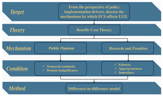 Based on the above analyses, this study aimed to use the benefit–cost theory as the theoretical foundation and the empirical model for discussing the mechanisms of the FCS policies on LUE from the perspective of the drivers of policy implementation. The main contributions of this study to the international literature are the following: (i) it analyzed the mechanism of FCS policies from the perspective of the drivers of policy implementation using the ideas of the benefit–cost theory; and (ii) it designed an identifiable strategy that can be used to test the mechanisms of the drivers of policy implementation (public opinion, and rewards and penalties) in order to assess the effects of FCS policies more accurately using the DID model.