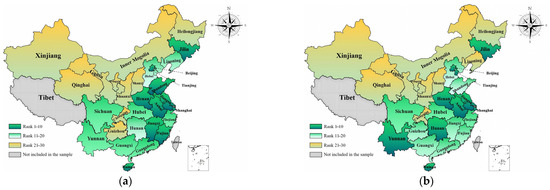 Figure 4a shows the spatial distribution of the mean LUE before the implementation of the FCS policy. It can be seen that the LUE showed clear spatial clustering from the southeast to the northwest, and from high to low. The top 10 regions are mainly distributed along the southeast coast, while the regions ranking in the middle (11–20) are mainly distributed in central China.