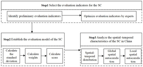 To quantify the level and analyze the spatial–temporal differentiation characteristics of SCs in China, a comprehensive evaluation framework of the SC was established utilizing the EWM and spatial autocorrelation method (global spatial autocorrelation and local spatial autocorrelation). The evaluation process is illustrated in Figure 1: