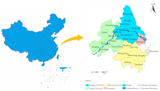 The Yangtze River Delta Urban Agglomeration (abbreviated as YRDUA, latitude: 27°03′ N–34°27′ N and longitude: 115°45′ E–122°50′ E), situated in southeastern China and bordered by the Yellow Sea and the East China Sea, is recognized as the world’s sixth-largest urban agglomeration [43]. As of 2018, the YRDUA encompassed a total area of 217,000 square kilometers, with a population of 154 million. Despite occupying only 2% of China’s land area, the YRDUA accounts for a staggering 20% of China’s total economic output, cementing its status as the most vibrant and open strategic region for China’s economic development [44]. The YRDUA consists of nine prefecture-level cities in Jiangsu Province (Changzhou, Yancheng, Wuxi, Suzhou, Taizhou, Nantong, Yangzhou, Nanjing, and Zhenjiang), eight prefecture-level cities in Zhejiang Province (Ningbo, Zhoushan, Hangzhou, Shaoxing, Jiaxing, Jinhua, Taizhou, and Huzhou), eight prefecture-level cities in Anhui Province (Chizhou, Anqing, Chuzhou, Tongling, Ma’anshan, Wuhu, Hefei, and Xuancheng), and Shanghai, as shown in Figure 2.