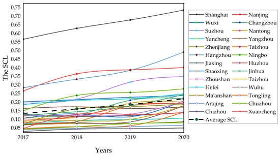 As can be seen in Figure 5, the majority of cities in the YRDUA showed an improvement in the SCL from 2017 to 2020, entering higher gradients. Notably, the number of cities in the excellent gradient increased from one to four, primarily located in the eastern part of the YRDUA, and they are all first-tier or new first-tier cities (Shanghai, Hangzhou, Nanjing, and Suzhou). Meanwhile, all cities have already moved away from the poor gradient. Moreover, it is observed from Figure 6 that the SCL of the YRDUA exhibited a consistent upward trend from 2017 to 2020. In particular, 21 cities demonstrated a stable growth pattern, while 5 cities (Yangzhou, Taizhou, Xuancheng, Jiaxing, and Shaoxing) experienced fluctuations in their growth.