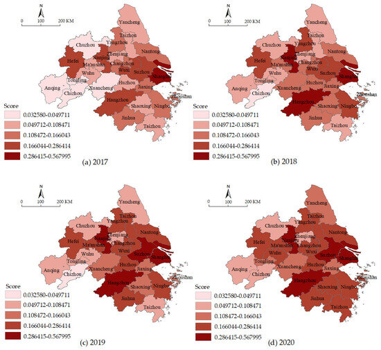 To gain a comprehensive understanding of the spatial and temporal distribution of the SC in the YRDUA, the SCL values of these 26 cities from 2017 to 2020 were inputted into ArcGIS software (10.8 version) and divided into five levels using the natural breakpoint method: excellent (0.286415–0.737779), good (0.166044–0.286414), general (0.108472–0.166043), inferior (0.049712–0.108471), and poor (0.032580–0.049711). The classification standards of the SCL in the YRDUA are presented in Table 4. Spatial distribution is shown in Figure 5, and temporal distribution is presented in Figure 6.