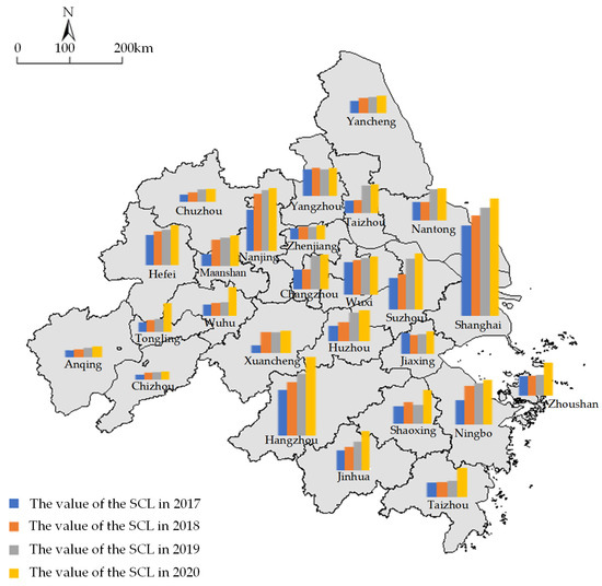 Utilizing the evaluation indicator weights for the SC obtained through the EWM coupled with the annual indicator data for each city spanning from 2017 to 2020, the SCLs of cities in the YRDUA were calculated and are presented in Figure 3 and Figure 4 (the detailed calculation results of the 26 cities are provided in Appendix A, Table A2). From 2017 to 2020, the SCL of the YRDUA showed an overall upward trend, while the characteristics of the growth varied. Specifically, in the period of 2017 to 2018, the SCL of Nanjing, Ningbo, and Ma’anshan exhibited fast growth rates. In the years 2018 to 2019, the SCL of Suzhou, Taizhou, Changzhou, and Nantong indicated that they were the cities with faster growth rates. From 2019 to 2020, the SCL with the most significant growth was mainly located in Zhejiang Province, in cities such as Hangzhou, Shaoxing, and Taizhou. Notably, Shanghai consistently maintained a significantly higher SCL than the regional average from 2017 to 2020, with sustained rapid progress. In contrast, Chizhou maintained the lowest SCL throughout the period, with relatively slow growth.