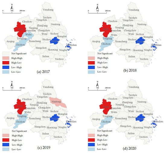 To further explore the local spatial autocorrelation between neighboring cities, the LISA clustering map of the SCL in the YRDUA from 2017 to 2020 was generated using ArcGIS software (10.8 version). As shown in Figure 7, 19.2%, 19.2%, 23.1%, and 15.4% of cities showed significant spatial correlation from 2017 to 2020, respectively. During 2017–2020, Hefei showed the ‘H-L’ cluster, Chizhou showed the ‘L-L’ cluster, and Jiaxing and Zhoushan presented the ‘L-H’ cluster. Meanwhile, Wuhu presented the ‘L-L’ cluster in 2017, Tongling showed the ‘L-L’ cluster in 2018 and 2019, and Nantong showed the ‘H-H’ cluster in 2019.