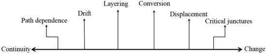 Finally, in terms of modes of institutional change, historical institutionalists have summarized several patterns, with a primary focus on gradual change: displacement, conversion, layering, and drift, each of which is briefly described below. Displacement is the replacement of well-established regulations with new rules. Displacement may not necessarily be an immediate, dramatic change but manifest as a gradual, unhurried process, especially when the introduction of a new institution directly challenges the role of the established institution. Conversion, on the other hand, signifies the continuation of an established institution infused with a new interpretation and implementation, which can also be perceived as the reinterpretation of an existing institution to fulfill a new purpose. Conversion occurs mainly as a result of the discrepancy between the institution and reality. Actors take advantage of the ambiguities within the rules to reapply the established institution to regulate the new reality. Layering is the process by which new formal rules are affixed to preexisting ones, thereby reshaping the normative function of the established rules. Established rules remain intact, but the gradual accumulation of new components may also fundamentally alter the system’s role. Drift takes place when the established institution persists, yet its role and normative capacity wane as the external environment changes. Drift occurs when actors fail to proactively uphold the institutional role in response to environmental changes [21]. With reference to the implications of these patterns of institutional change, their relative positions can be categorized along a spectrum that spans from “change” to “continuity” based on the extent of modifications applied to the established rules. This categorization is depicted in Figure 1.