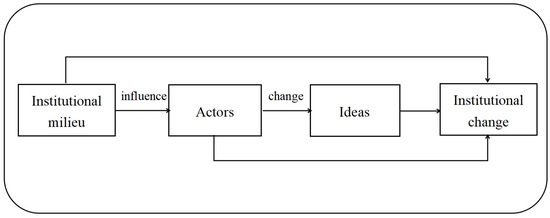In addition, it is important to recognize that ideas are also a key element of historical institutionalism. Ideas serve as abstract representations of the material world in an individual’s cognition, encompassing practical experiences, value concepts, thoughts, and cognition, among other factors [16]. Despite the great importance of ideas, they remain inert on their own and require the agency of actors to shape policies and create institutions. Historical institutionalists introduced “ideas” into institutional analysis, arguing that ideas constitute the very heart of institutional change, and alterations in the ideas embraced by actors exert an influential impact on such change. Institutions are the vessels of ideas, and ideas can guide the behavioral patterns of individuals and collectives through the reconstruction or consolidation of their conceptions of self-interest and ultimately realize the synergistic evolution of “institutional milieu-actors-ideas”.