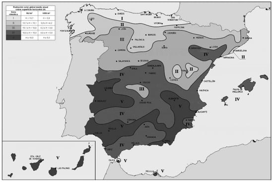 - Edification Technical Code (CTE). HE Basic Document. Climatic Zoning according to Diary Annual Average Global Solar Radiation. Ministry of Transports, Mobility and Urban Agenda: Spain, 14 June 2022. Available online: https://www.codigotecnico.org/pdf/Documentos/HE/DccHE.pdf (accessed on 6 September 2023).
