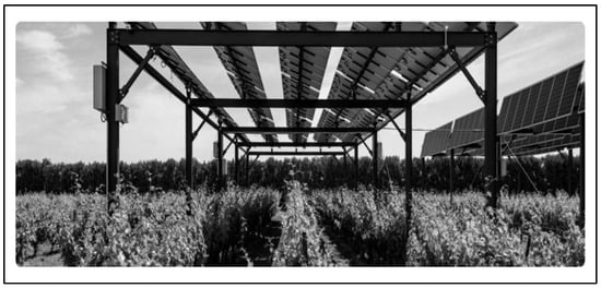 Obviously, these initiatives are not exempt from controversy and disagreements. On one hand, there are supporters of using these techniques in less productive areas, or areas of low agricultural interest with unfavorable soil and climatic conditions, not seeming appropriate for the case of great agricultural value crops, such as vineyards. On the other hand, there are more conciliatory people with future vision, which would decidedly turn to “agrivoltaism”, preventing vines from being uprooted and favoring solar panel shading vine cultivation to satisfy crop needs [] while producing green energy in the same plot, and so improving agricultural producers’ competitiveness. Studies confirm the beneficial interaction between agricultural and solar energy productions in the same area in terms of land-use efficiency, water use efficiency and photovoltaic panel efficiency []. Moreover, social investigations carried on with livestock and crop farmers, solar grazers and policy experts indicate, on one hand, the recognition of the potential benefits of “agrivoltaic” systems, and, on the other hand, affordability of the identified barriers by wise planning and mutually profitable land agreements [].