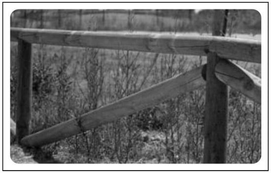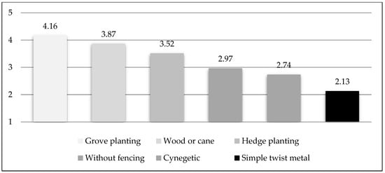 They were also asked about their preference in the location of the energy transmission lines, aerial or underground, and also about the type of perimeter fencing of the photovoltaic installation, being able to choose between the absence of it, or within different options such as simple torsion, cynegetic, natural structures of wood or cane, and natural perimeter protection by trees or shrubs (Figure 5, Figure 6, Figure 7 and Figure 8). For this last option, they were also asked if they would prefer hedges, plantations, or the formation of groves with local species from the area.