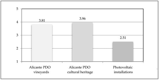 Regarding landscape quality, respondents value the wine-producing landscape of the Alicante PDO territory and its concomitant cultural heritage more positively (3.81 and 3.96) than landscape quality related to photovoltaic panel installations (2.51) (Figure 9).