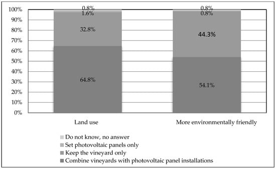 The preferred option of land use is the combination of vineyards with photovoltaic panel installations, chosen by 64.8% of those surveyed, and also being considered the most environmentally friendly option by 54.1%. The second choice is maintaining vineyards only with 32.8%, which is considered by 44.3% of the respondents as more respectful to the environment. Finally, the less attractive option is the solo use of photovoltaic panels, since only 1.6% consider it to be the best option for land use, and even less (0.8%) consider it to be the most respectful to the environment (Figure 10).
