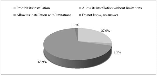 A vast majority of the respondents (68.9%) are in favor of allowing the installation of photovoltaic panels, but with certain limitations. However, almost a third (27.0%) would totally prohibit them, and only a scant 2.5% would allow them without any limitations (Figure 11).