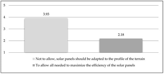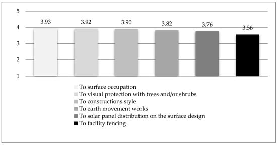 In the event that the implementation of photovoltaic panel installations is allowed by the competent authority, there is a broad agreement to require the six limitations that have been proposed according to the following order of preference: the surface is to be occupied by the installation of photovoltaic panels (3.93), the visual protection of the installation by means of trees and/or bushes (3.92), the style of the necessary operational constructions (3.90), the needed earth movement to execute the installation (3.82), the distribution design of the photovoltaic panels on the surface (3.76), and the fencing of the installation (3.56) (Figure 12).