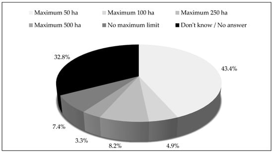 Regarding the limitation of the total area to be occupied, the most chosen option by almost half of the sample (43%) has been a maximum of 50 ha (equivalent to 100 soccer fields or 1 golf course), while the rest has not exceeded 10%. It should be noted that a third (32.8%) of the sample consider that they do not have enough criteria to answer (Figure 13).