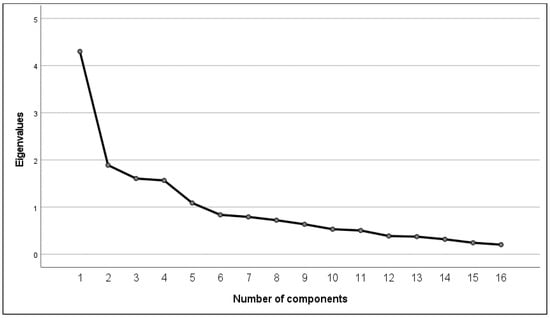 Lastly, to identify the main factors that underlie the survey, an exploratory factorial analysis is convenient. This multivariable analysis technique allows the reduction in the excess of information associated with multivariable collection to the main representative components. These latent components or factors represent the group of questions that explain relations among them without lack of information []. Principal component analysis and Kaiser’s varimax normalization were the extraction and rotation methods used, respectively.